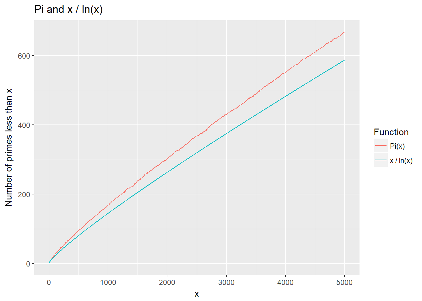 Mathematicians have been concerned with counting prime numbers for some time now. In fact the first instance of a so called ‘Prime Counting Function’ comes from the French Mathematician Adrien-Marie Legrendre who in the late eighteenth century conjectured the Prime Number Theory. It stated that one could count the number of primes less that a value \(n\). This was denoted as \(\pi(x)\). For example, for \(x = 10\), \(\pi(10) = 4\) as there are four prime numbers between 0 and 10, these are 2, 3, 5 and 7. An early approximation of the Prime Counting Function was \(\pi(x) \approx \frac{x}{\ln(x)}\).